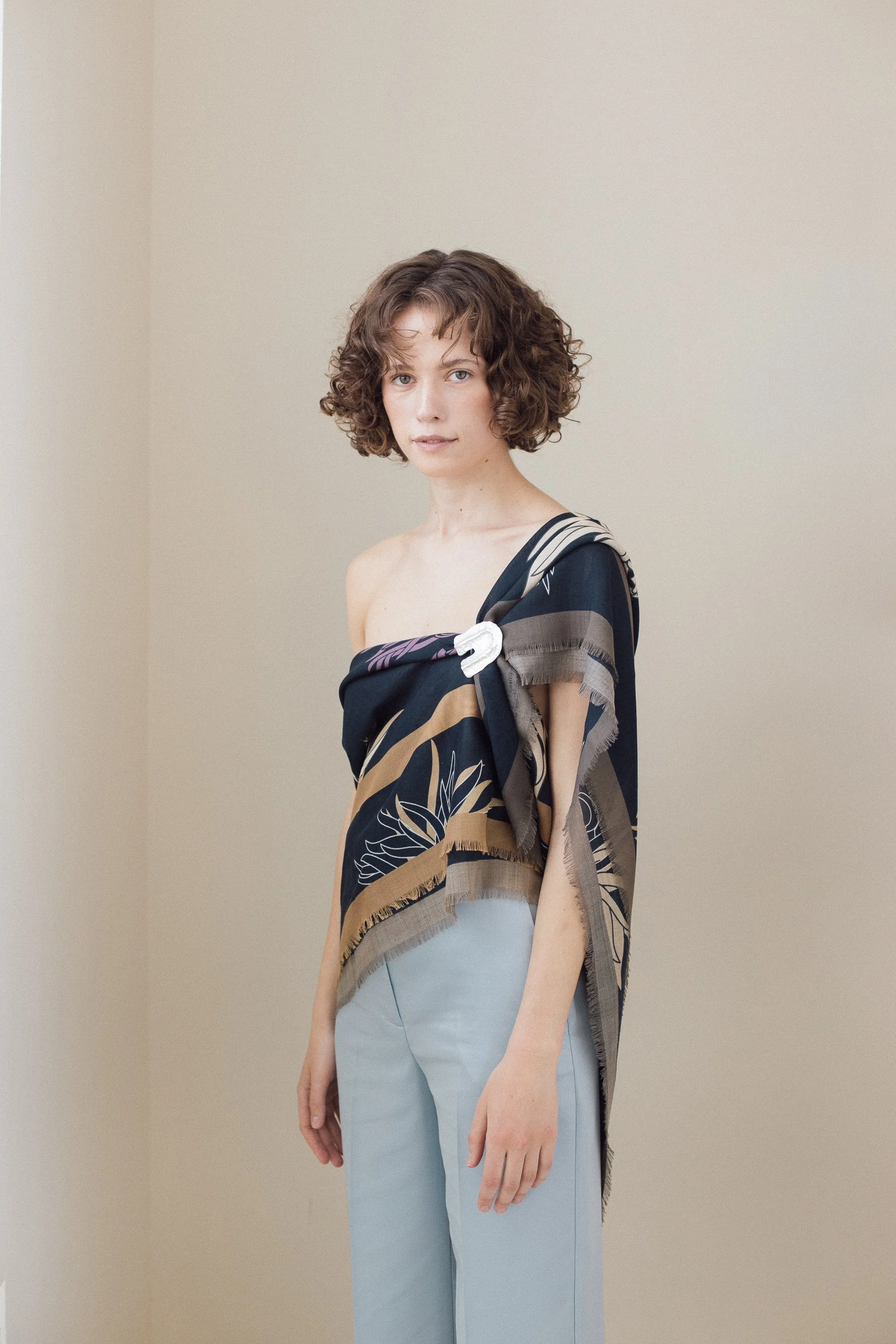 100 % fresh wool & Silk blend maxi scarf ( 133 x 133 cm ) featuring a dark navy Actinaria print with a multicolour gradient. Hand fringed hem, can be styled as both a scarf and a Sarong dress or top.